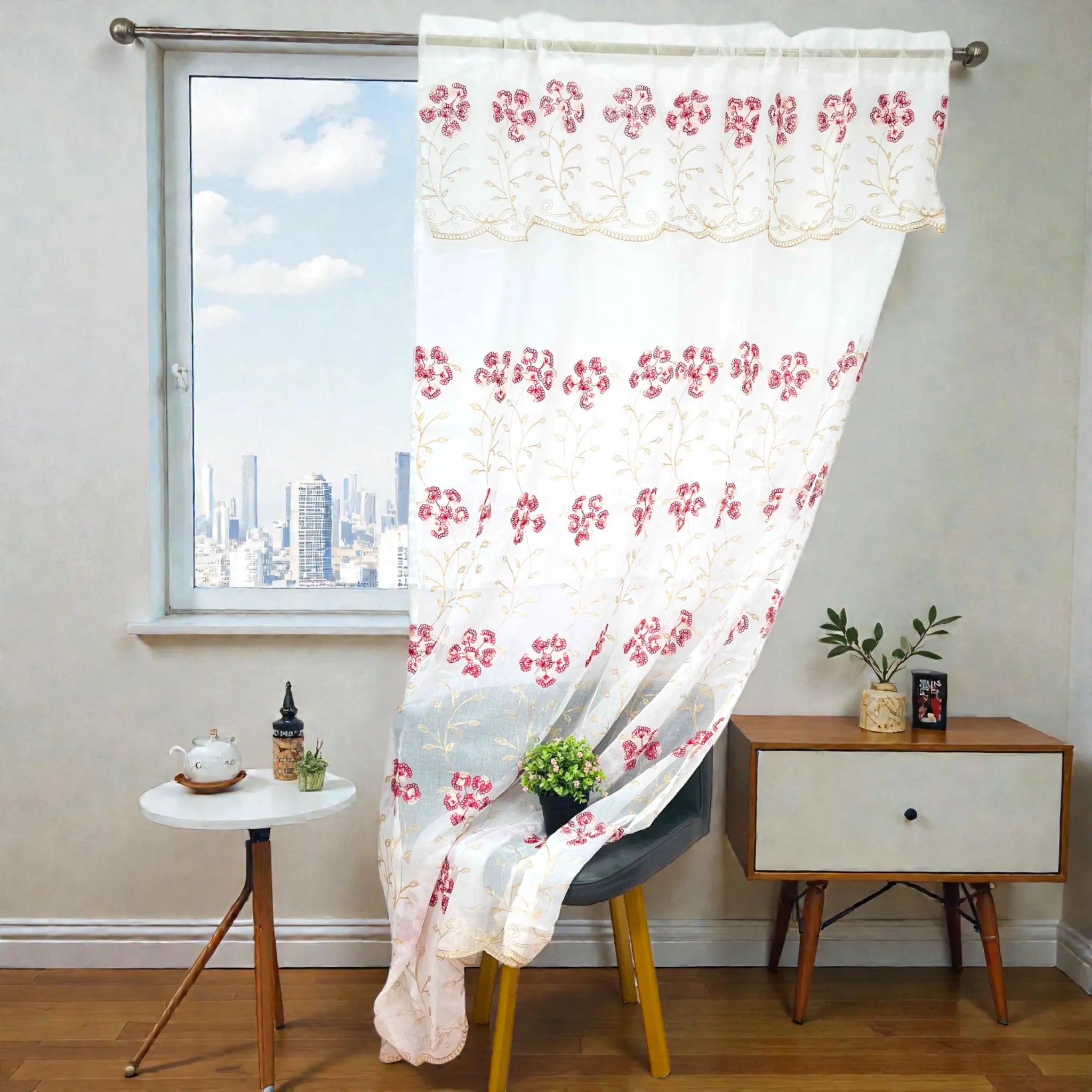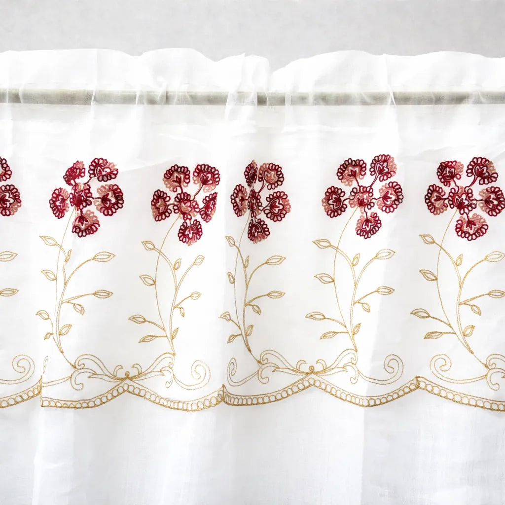Esta cortina ayuda a crear espacios más luminosos y frescos gracias a su tejido traslúcido. El bordado floral agrega un detalle decorativo que realza la ventana sin sobrecargarla visualmente. La cenefa incluida proporciona un acabado superior más completo y elegante.