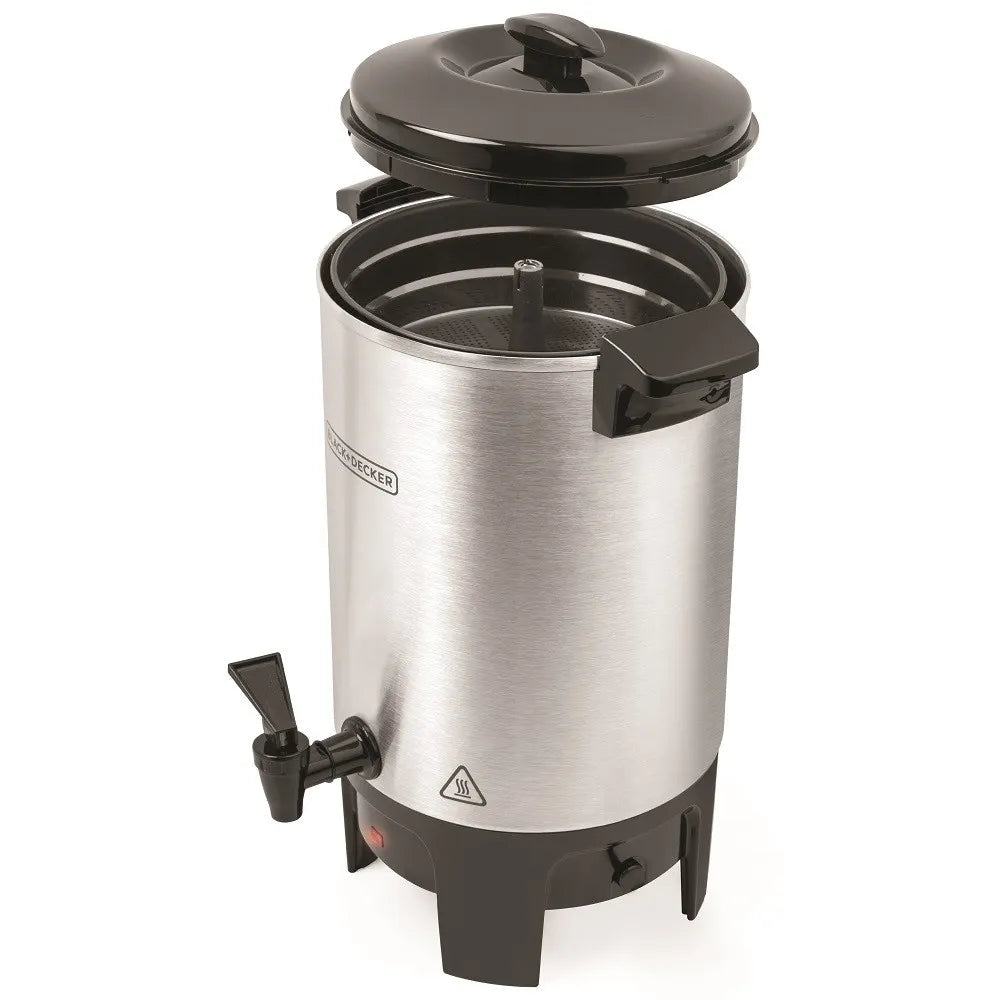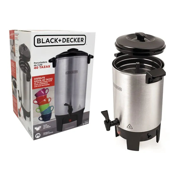 Prepara café para todos en minutos con la percoladora BLACK+DECKER de 40 tazas, perfecta para oficinas, eventos, reuniones familiares o negocios. Su diseño eficiente y de gran capacidad te permite servir hasta 40 tazas rápidamente, ideal para cuando necesitas mucho café sin complicaciones.