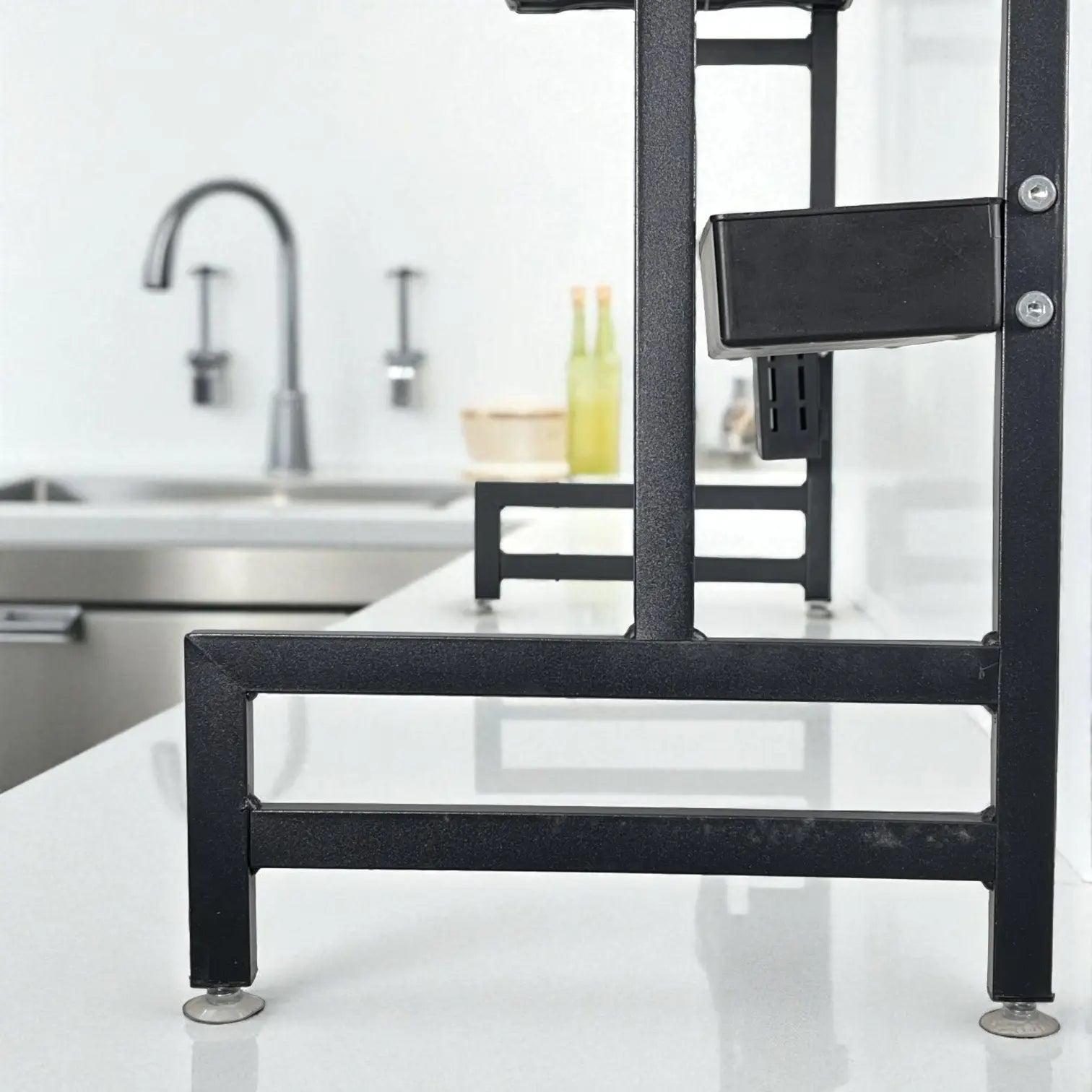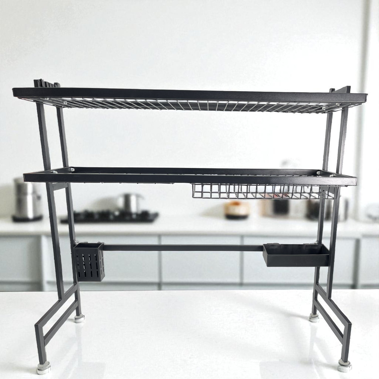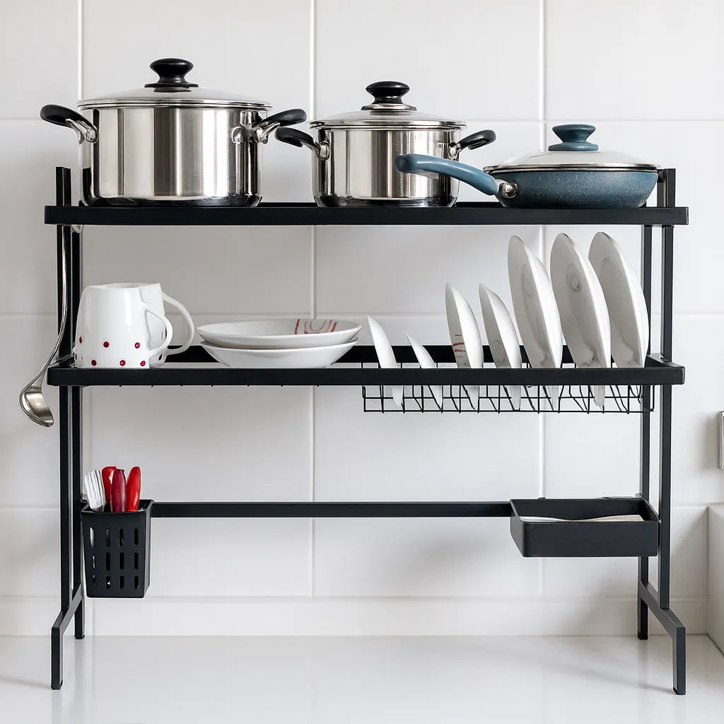 Este organizador de cocina cuenta con dos niveles amplios que permiten escurrir platos, tazas, ollas y utensilios grandes sin ocupar espacio adicional en la encimera. Incluye porta cubiertos, porta utensilios y soporte lateral para una mejor organización. Su estructura sólida evita el óxido y ofrece gran durabilidad y estabilidad, incluso con peso.
