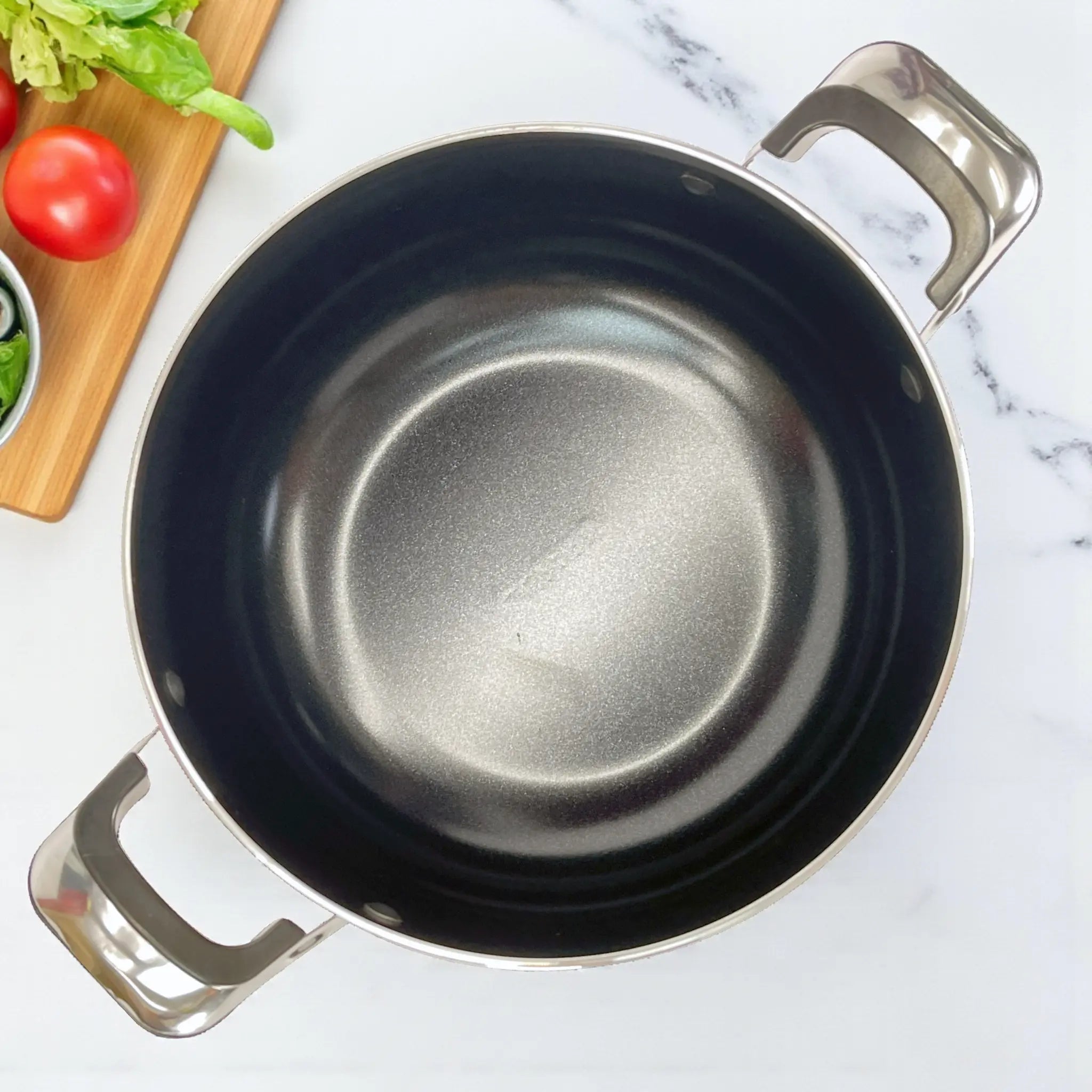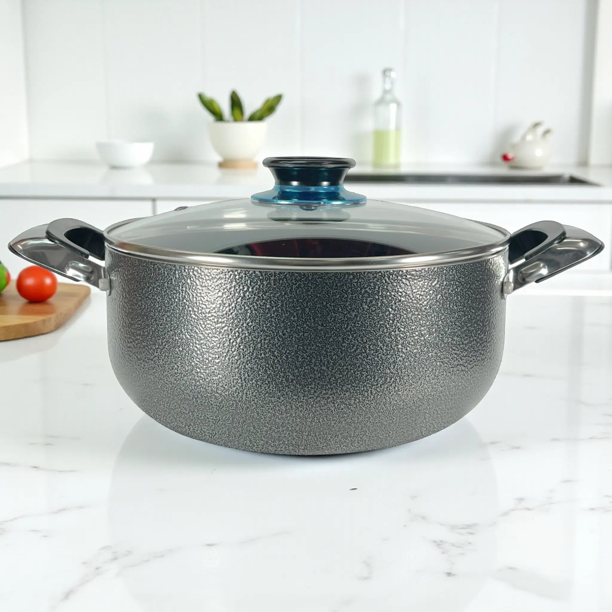 Su exterior con acabado de granito le da un toque moderno y duradero, mientras que las tapas de vidrio templado te permiten supervisar tus recetas sin perder calor. Los mangos de baquelita resistentes al calor brindan seguridad y comodidad durante el uso.