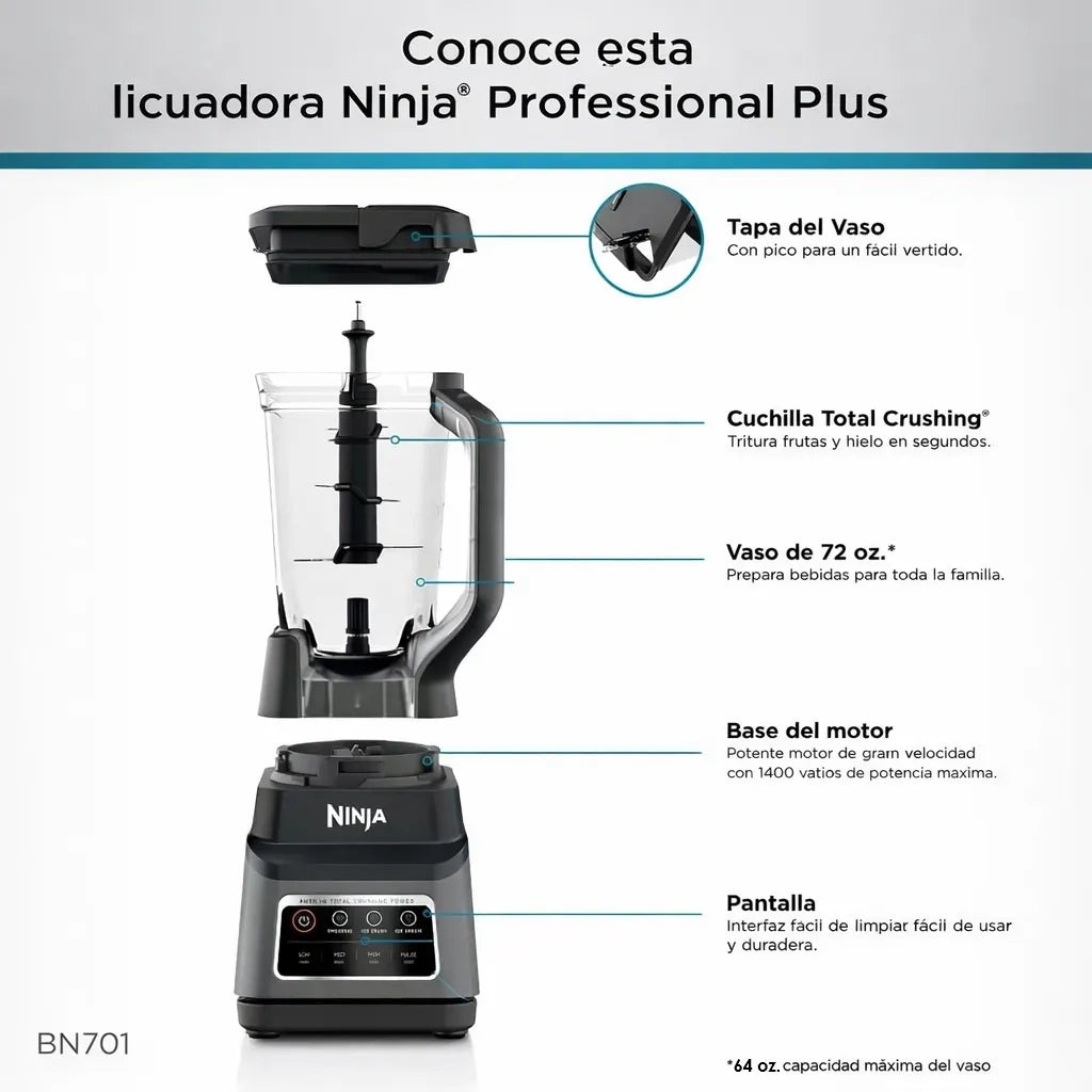 La Ninja Professional Plus con Auto-iQ BN701 es una licuadora de alto desempeño pensada para quienes buscan potencia, capacidad grande y facilidad de uso en una sola máquina. Integra una base de motor de 1400 watts pico, una jarra Total Crushing de 72 oz y 3 programas automáticos Auto-iQ, diseñados para preparar smoothies, bebidas congeladas y helados o postres fríos con solo presionar un botón.