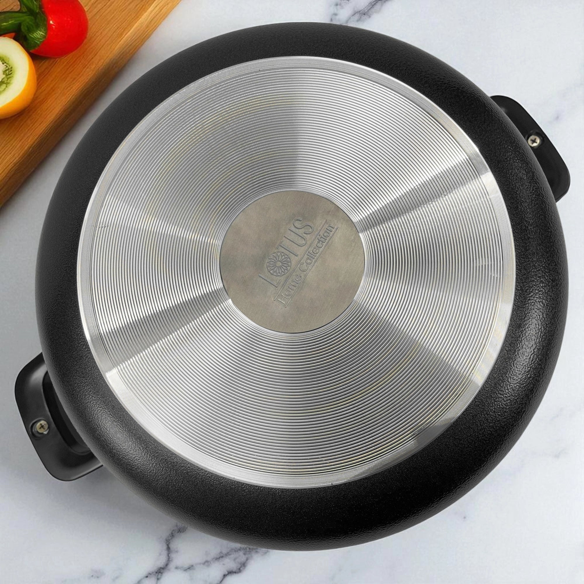 La olla antiadherente Lotus Home Collection de 30 cm y 8.7 litros es ideal para preparar comidas familiares de manera práctica y saludable. Gracias a su recubrimiento antiadherente libre de PFOA, los alimentos no se pegan y requieren menos aceite, lo que facilita una cocina más ligera y fácil de limpiar.
