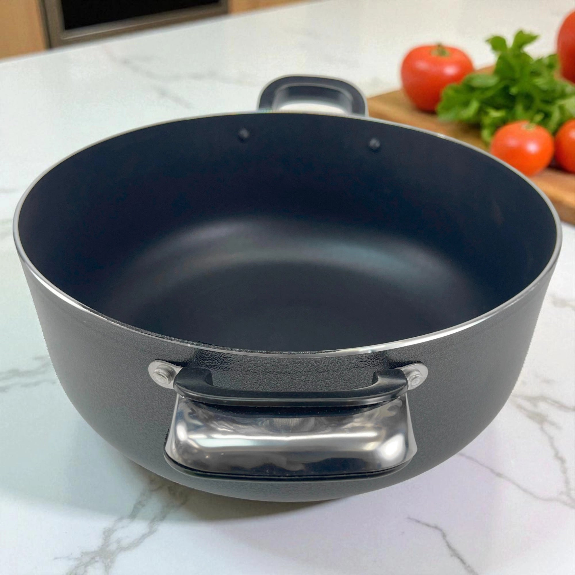 El fondo difusor en espiral de acero inoxidable asegura una distribución uniforme del calor, evitando puntos fríos y logrando cocciones más rápidas y homogéneas. Sus asas metálicas resistentes al calor ofrecen un agarre seguro y cómodo durante su uso.