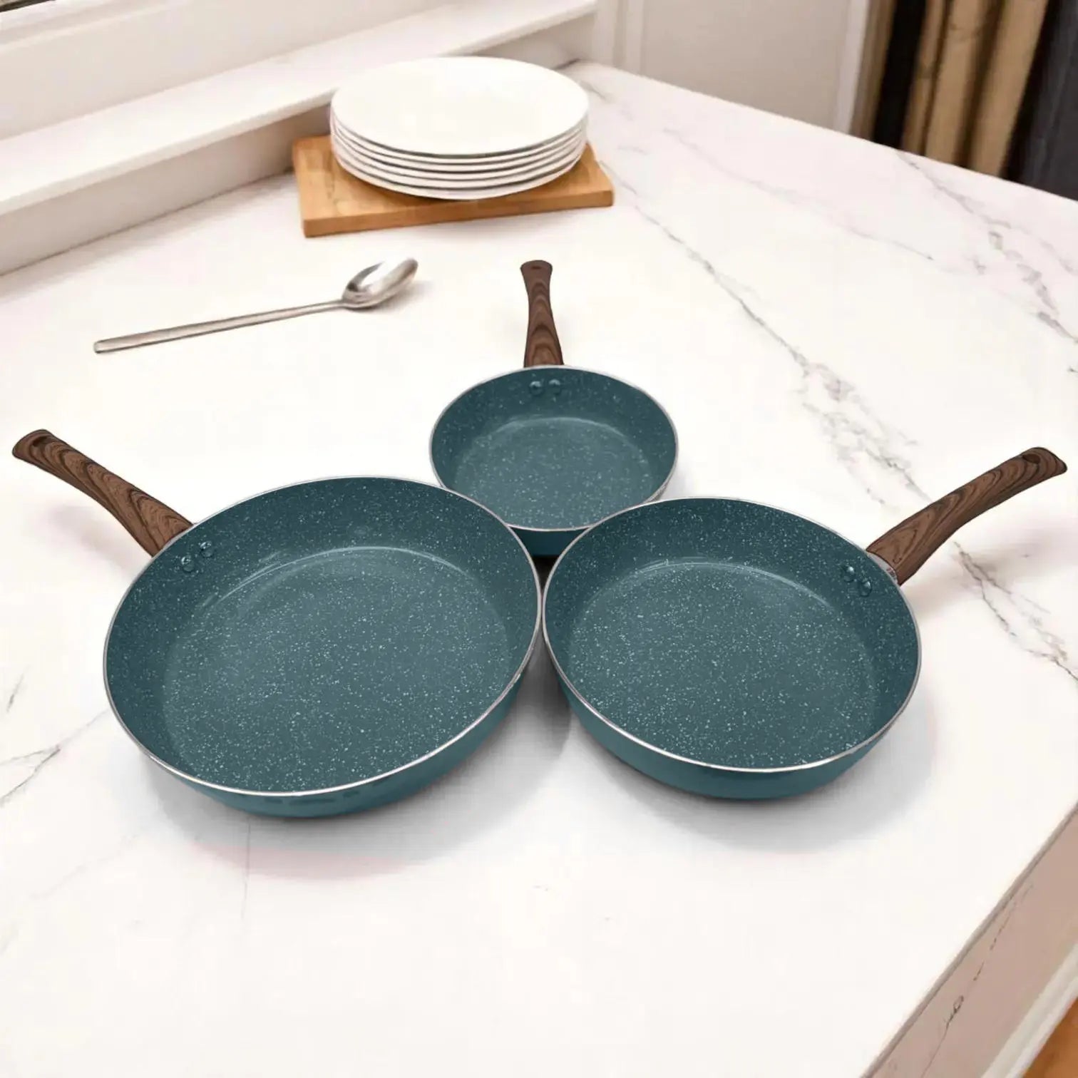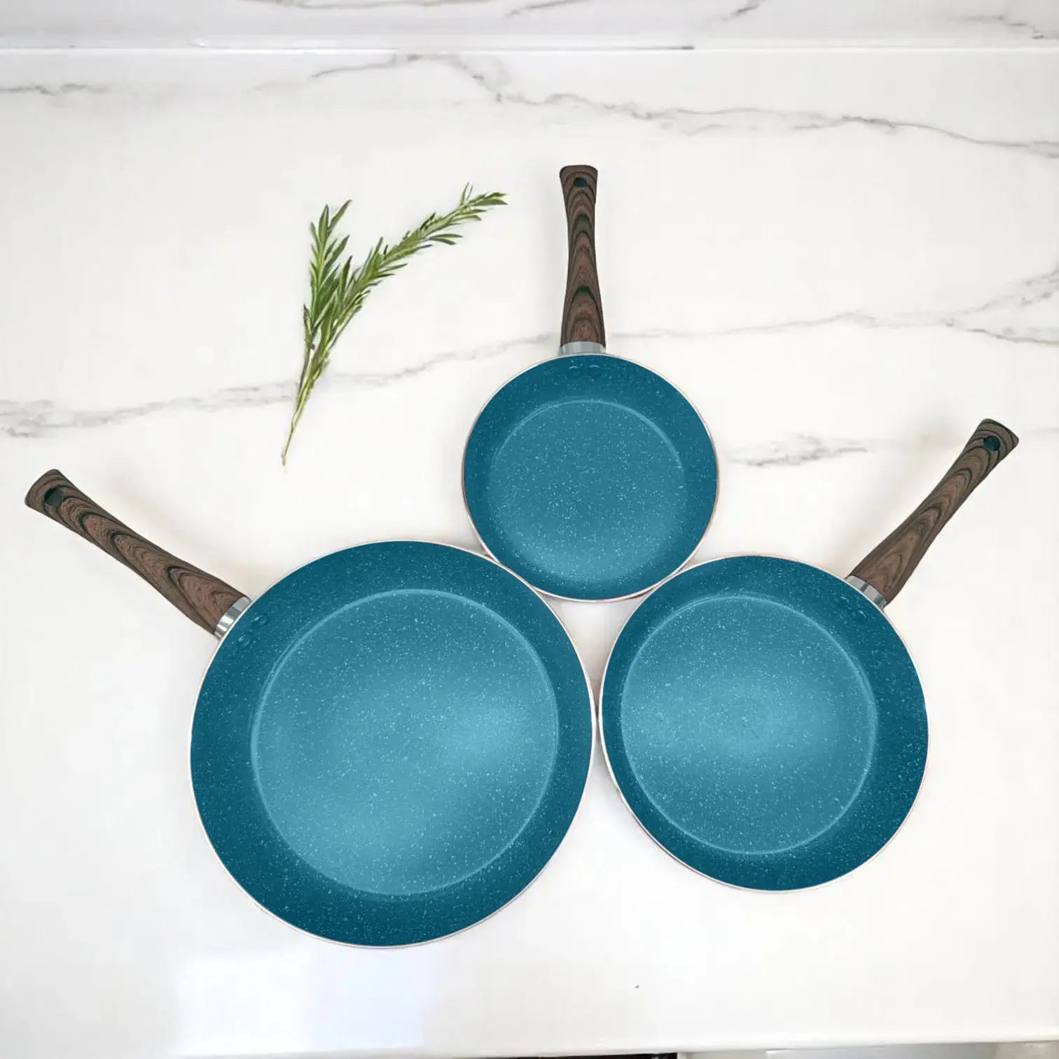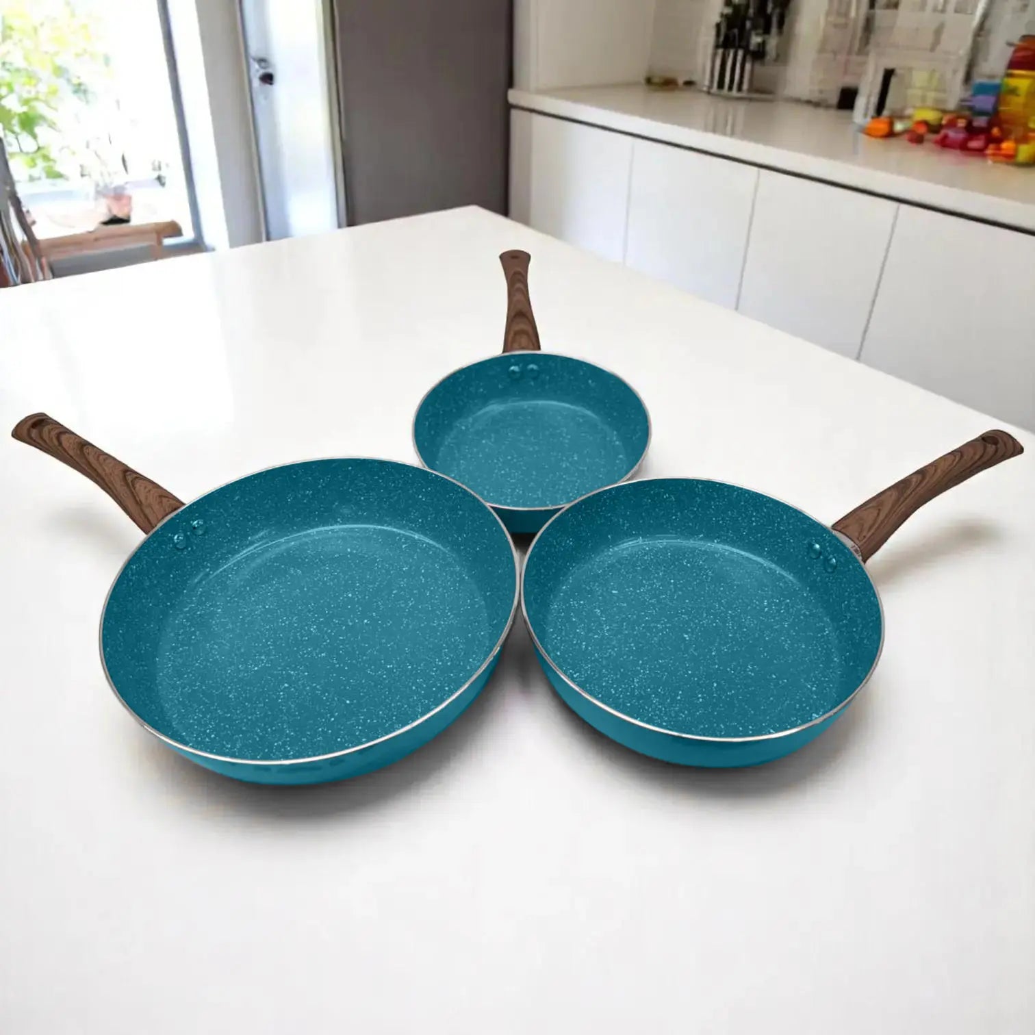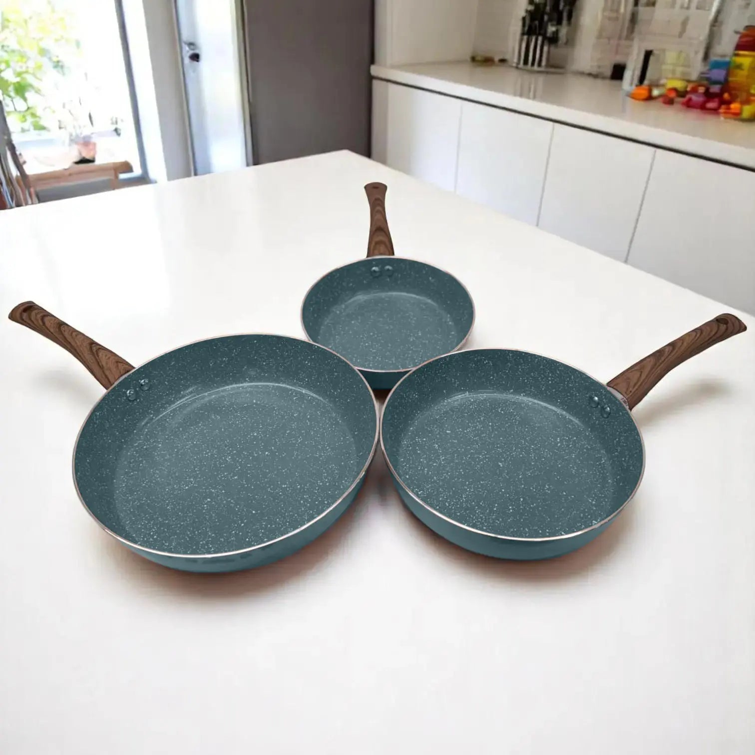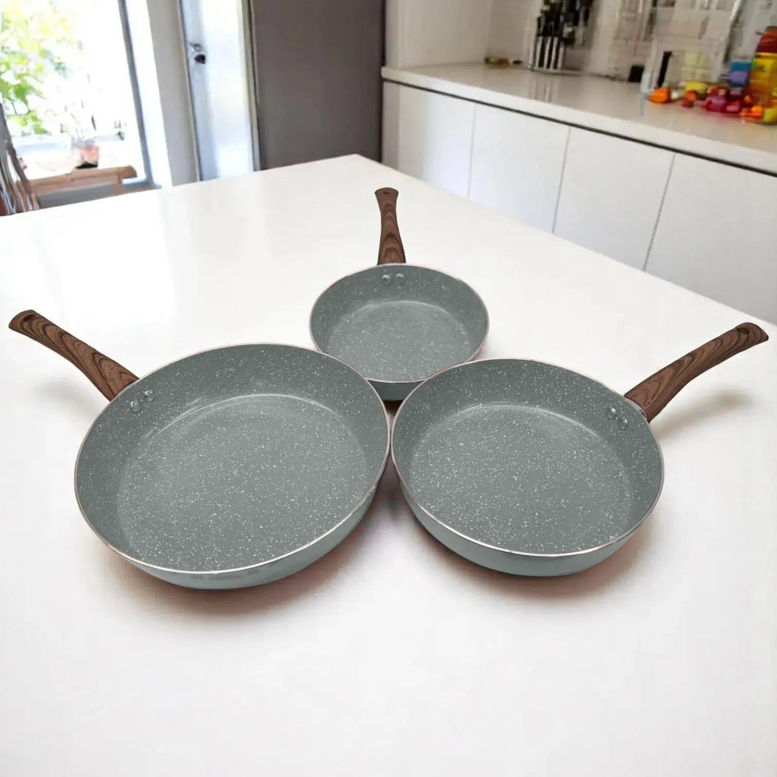 Diseñado para quienes buscan practicidad y resultados deliciosos, este set incluye sartenes de 20 cm, 24 cm y 28 cm, perfectas para preparar desde huevos y panqueques hasta carnes, salteados y platillos familiares.