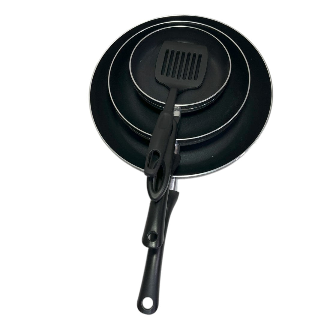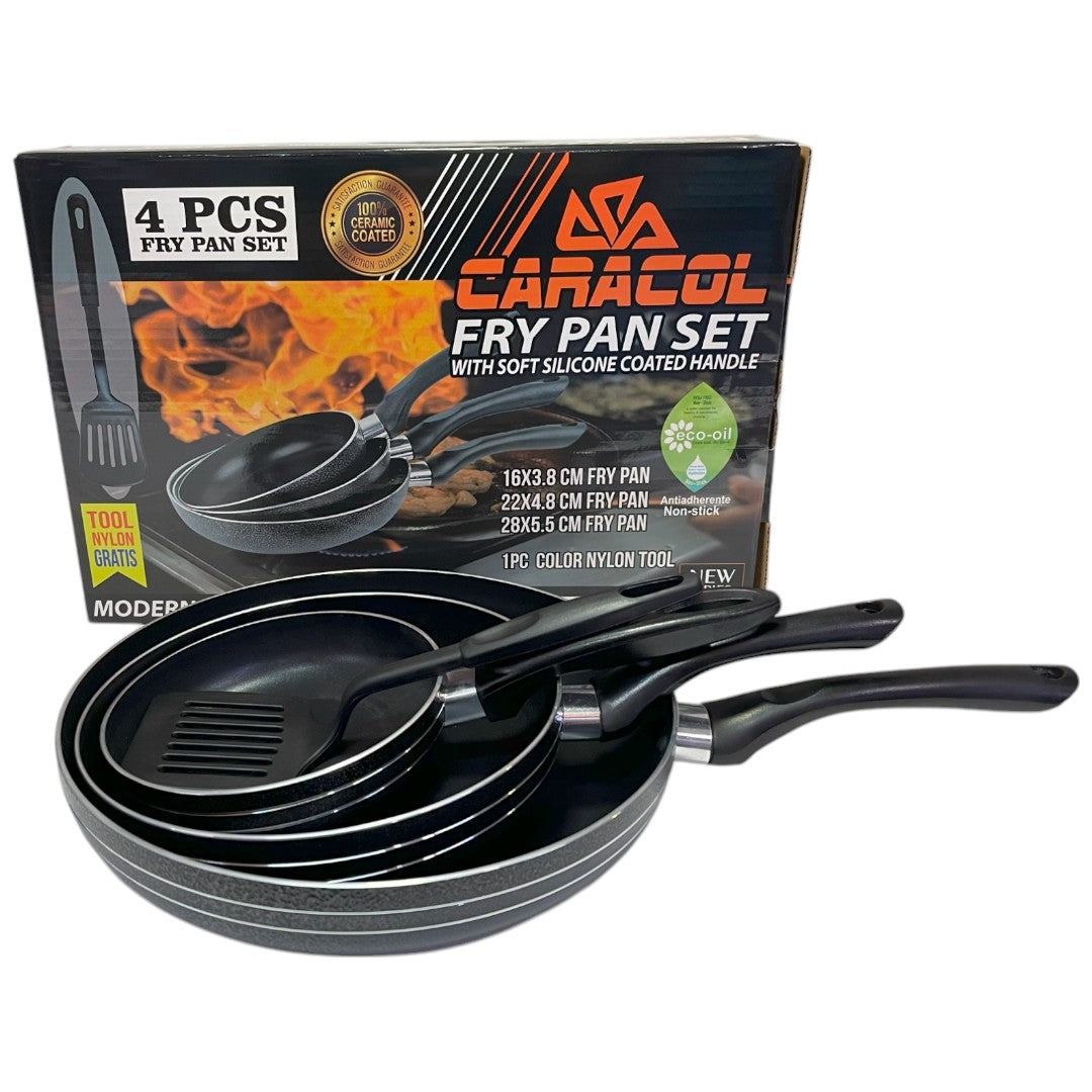 El set de sartenes Caracol incluye 3 sartenes de diferentes tamaños con recubrimiento antiadherente y mango recubierto de silicona para un agarre seguro y cómodo. Su diseño está pensado para una cocción eficiente y uniforme, ideal para cualquier cocina. Además, incluye una espátula de nylon de regalo.