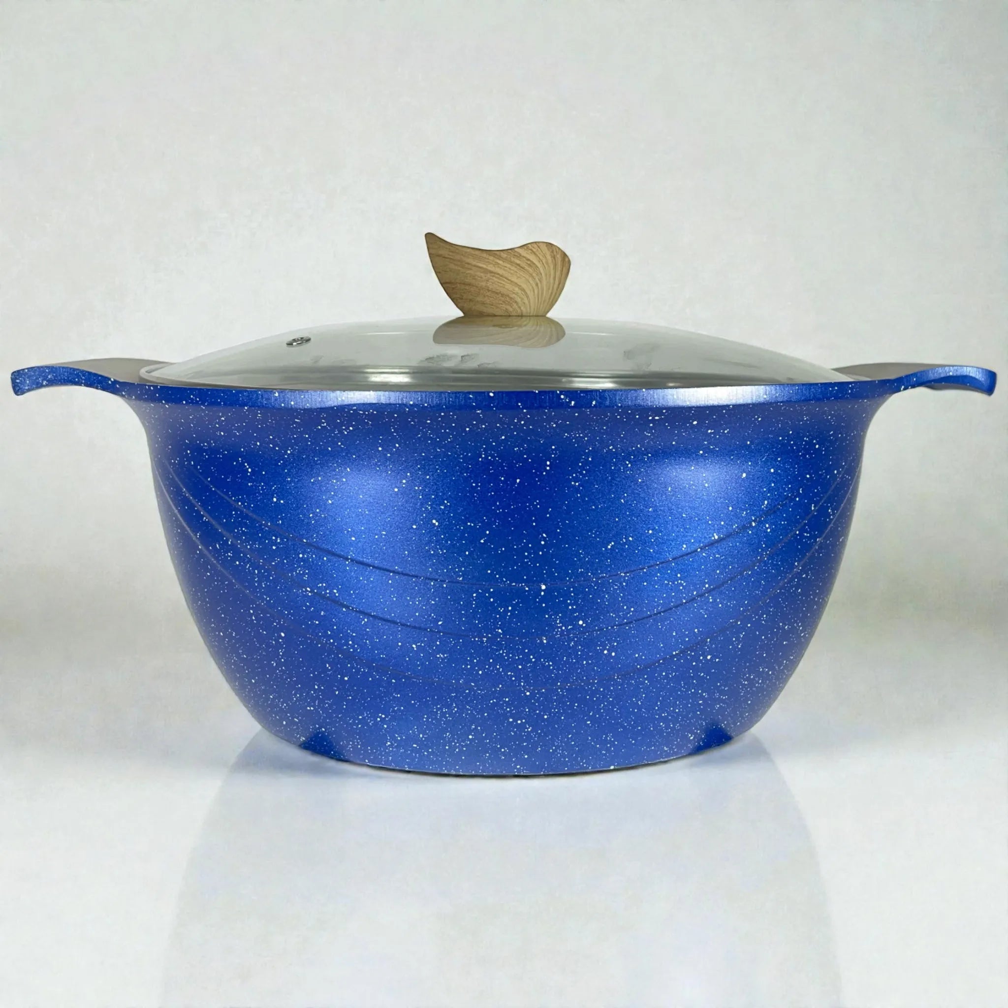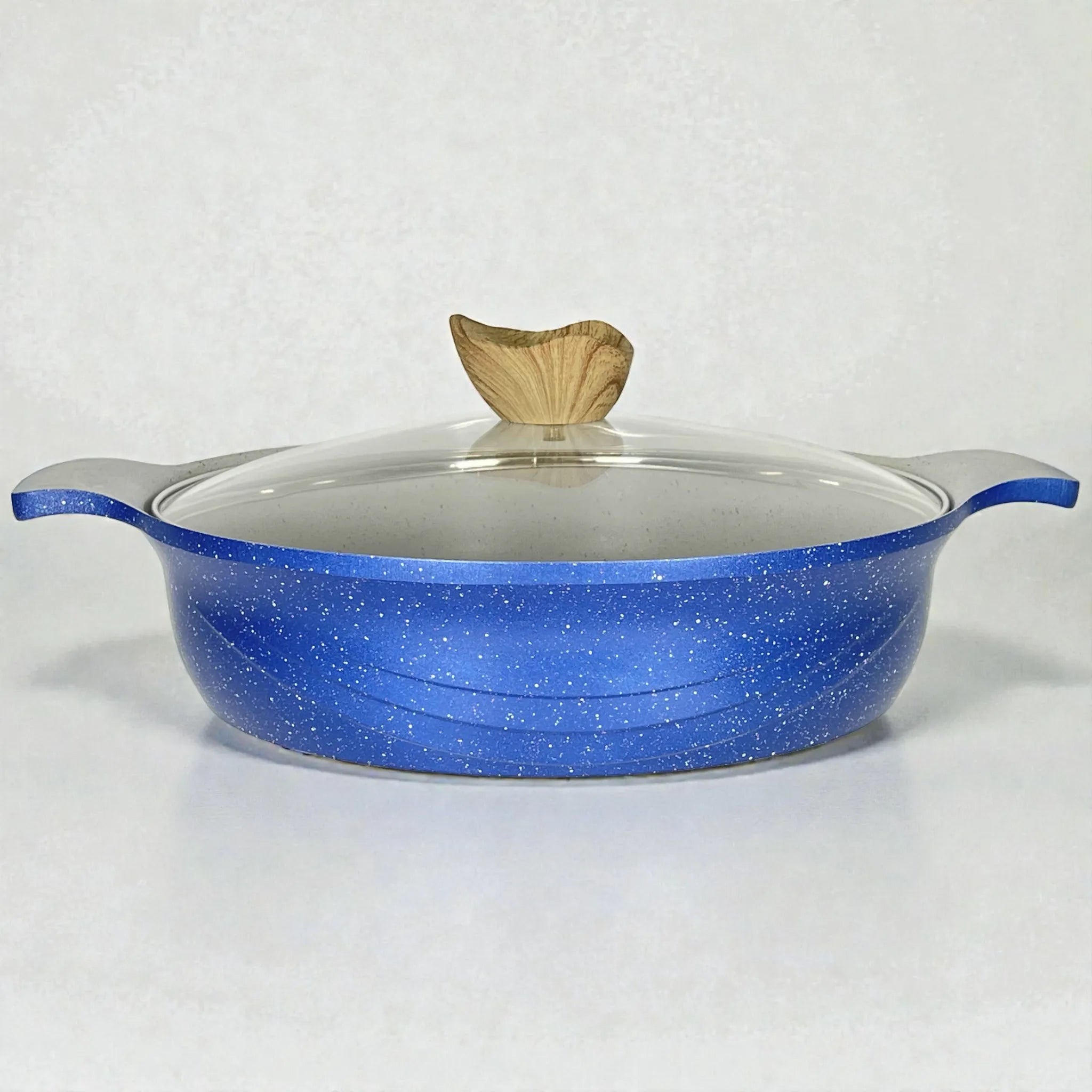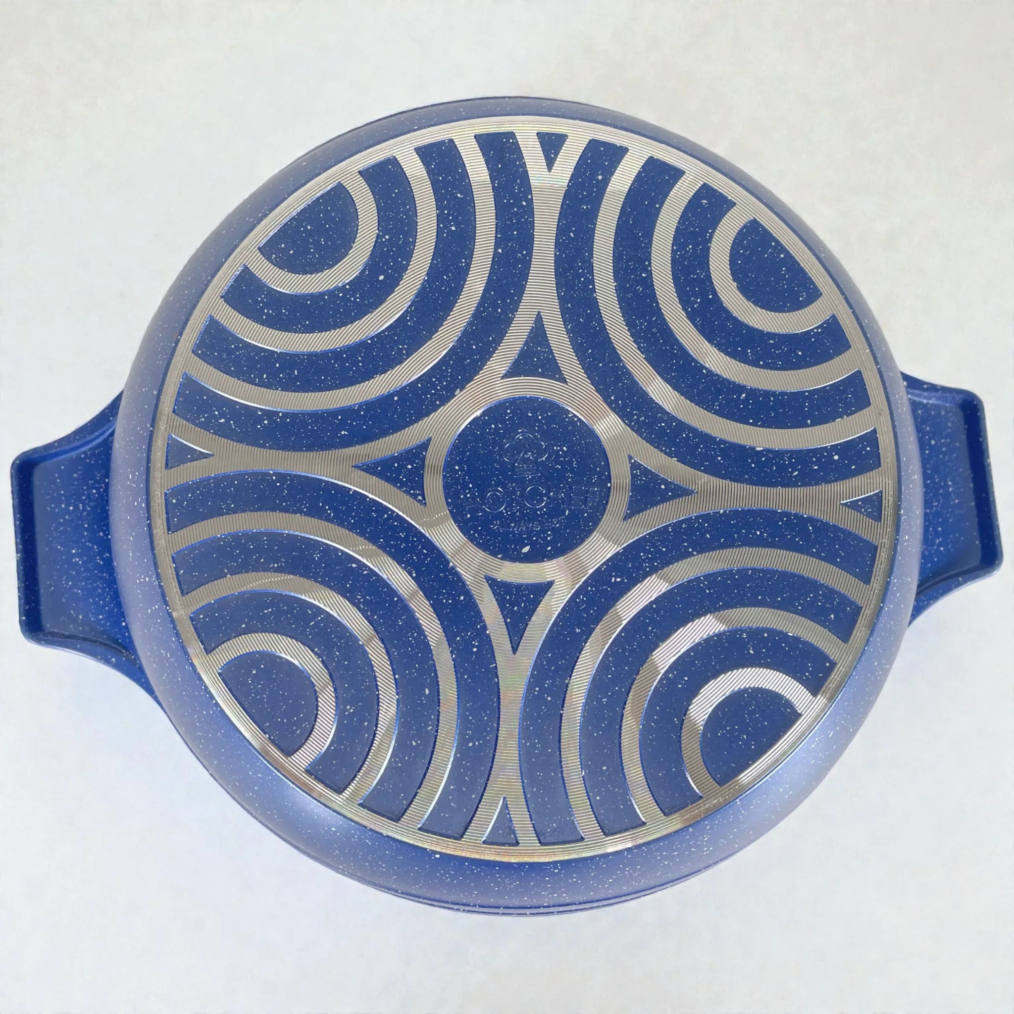 El recubrimiento antiadherente tipo mármol reduce la adherencia de los alimentos, facilitando la limpieza y permitiendo cocinar con menor cantidad de aceite. Su acabado en color azul granito aporta un estilo moderno y elegante que se integra fácilmente en cualquier cocina.